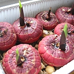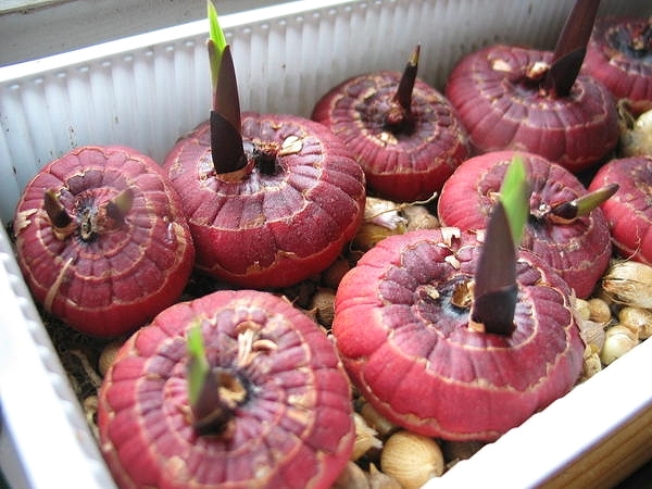 Клубнелуковицы гладиолусов, хранившиеся в холодном помещении (ниже +100) в начале апреля внесите в теплое помещение и разложите около источников тепла (например, около отопительной батареи). При этом температура должна быть около 350, влажность - в пределах 80-90%. Чтобы добиться такой влажности, поставьте около ящика с клубнелуковицами сосуд с водой, или повесьте влажную тряпку, которую периодически смачивайте.