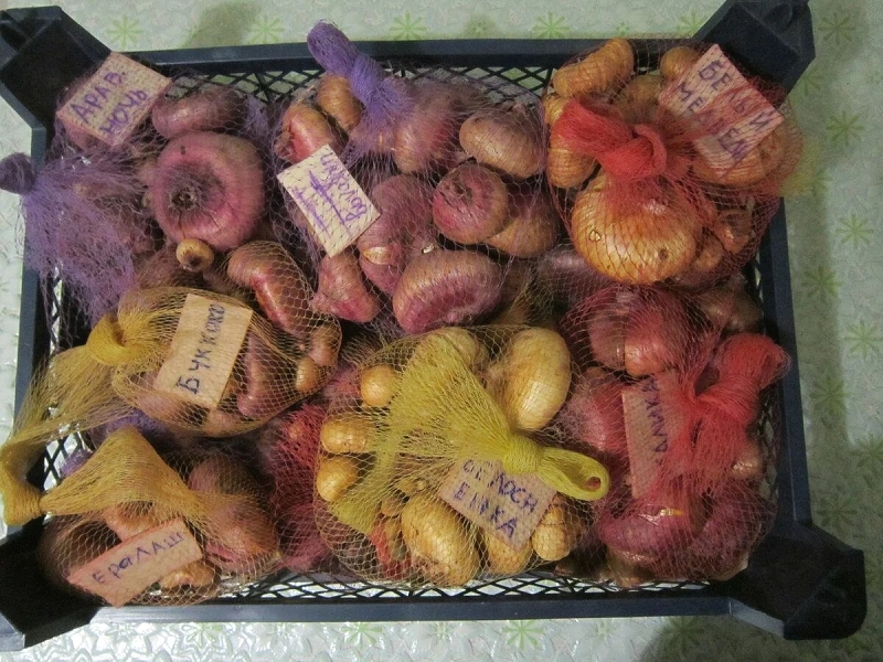 Я досушиваю гладиолусы дома, в сеточках, подвешанных под потолком в кухне на 2-3 недели. Возле батарей отопления лучше не сушить - при перегреве вы можете их «сварить». Очень важно отобрать на хранение только здоровый материал, отбраковывая все, поврежденное болезнями или вредителями. Хранить хорошо в подвале, но если его нет - на холодном подоконнике или у балконной двери. Оптимальная температура при этом 3-90. При хранении в холодильнике важно не пересушить и не подморозить клубнелуковицы. Неплохо подкладывать резаный чеснок, который отпугивает трипсов. И не реже раза в месяц просматривать материал, убирая все поврежденное.