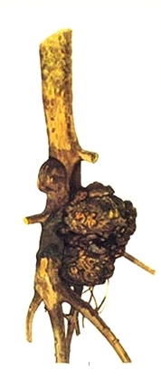 Такие изменения корней вызывает опасное заболевание - корневой рак. Возбудитель обитает в почве, и через ранки и трещинки проникает в растение. Пораженные ткани разрастаются, наросты - сначала гладкие, а затем бугристые и шероховатые. Внутри наросты твердые, деревянистые. При сильном поражении растения останавливаются в росте, преждевременно желтеют, плоды становятся безвкусными. Особенно опасна болезнь на малине.