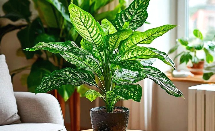 Диффенбахия - растение очень выносливое. Она способна выживать в самых неподходящих условиях. Выживать-то она выживает, но выглядит при этом непривлекательно. Оптимальным для нее будет яркий, но рассеянный свет, умеренное тепло, обильный летом и более сдержанный зимой полив, высокая влажность воздуха. Помочь может опрыскивание кипяченой (чтобы не оставалось белесых пятен на листьях) водой и периодическое купание под душем.